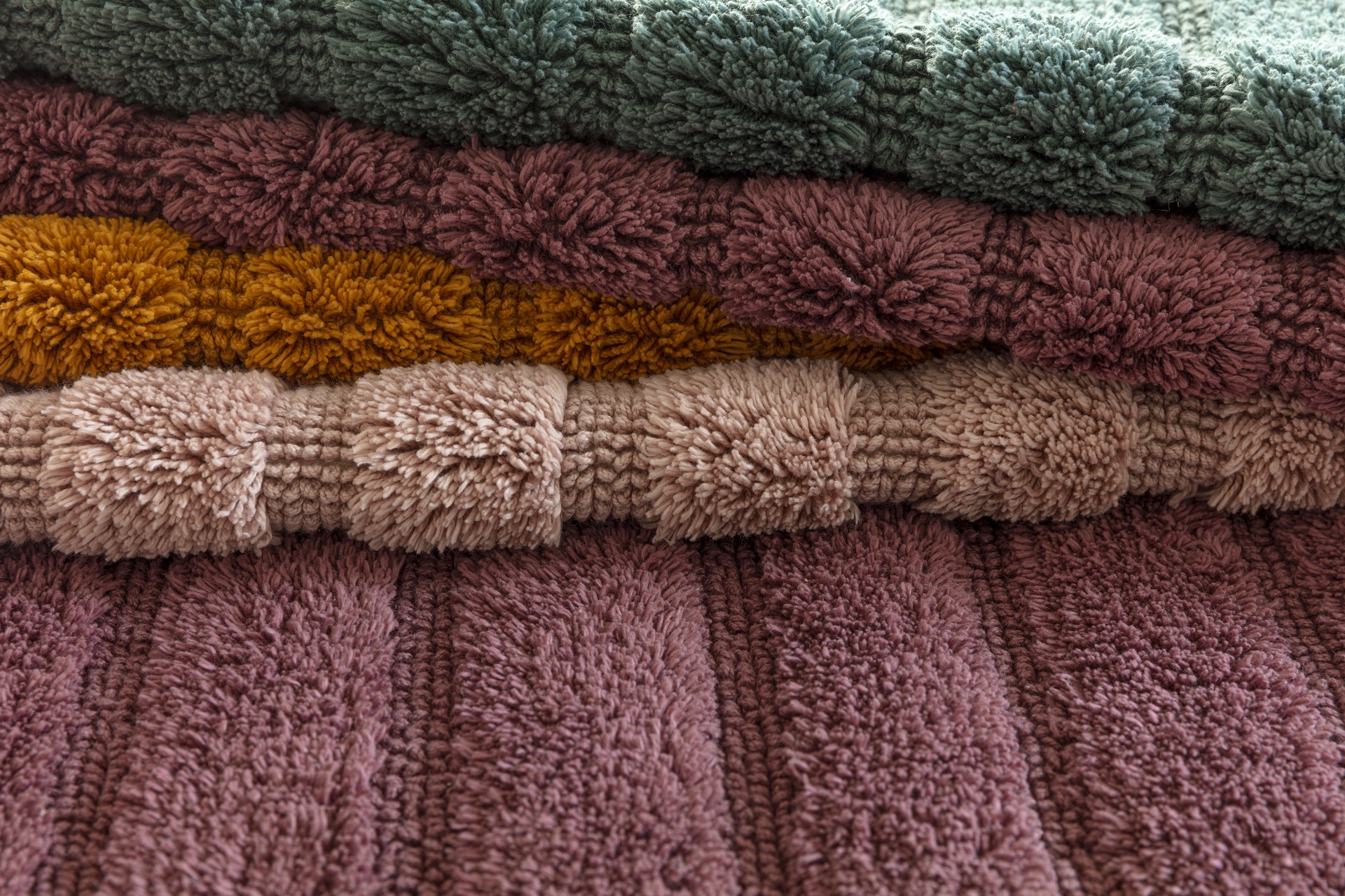 De badmat best niet samen met ander wasgoed wassen omdat ze kan pluizen. Donkere